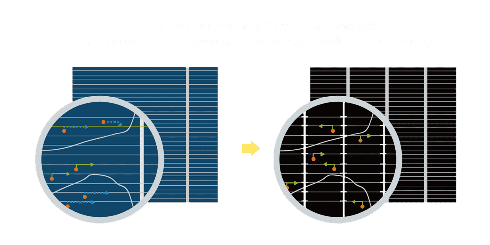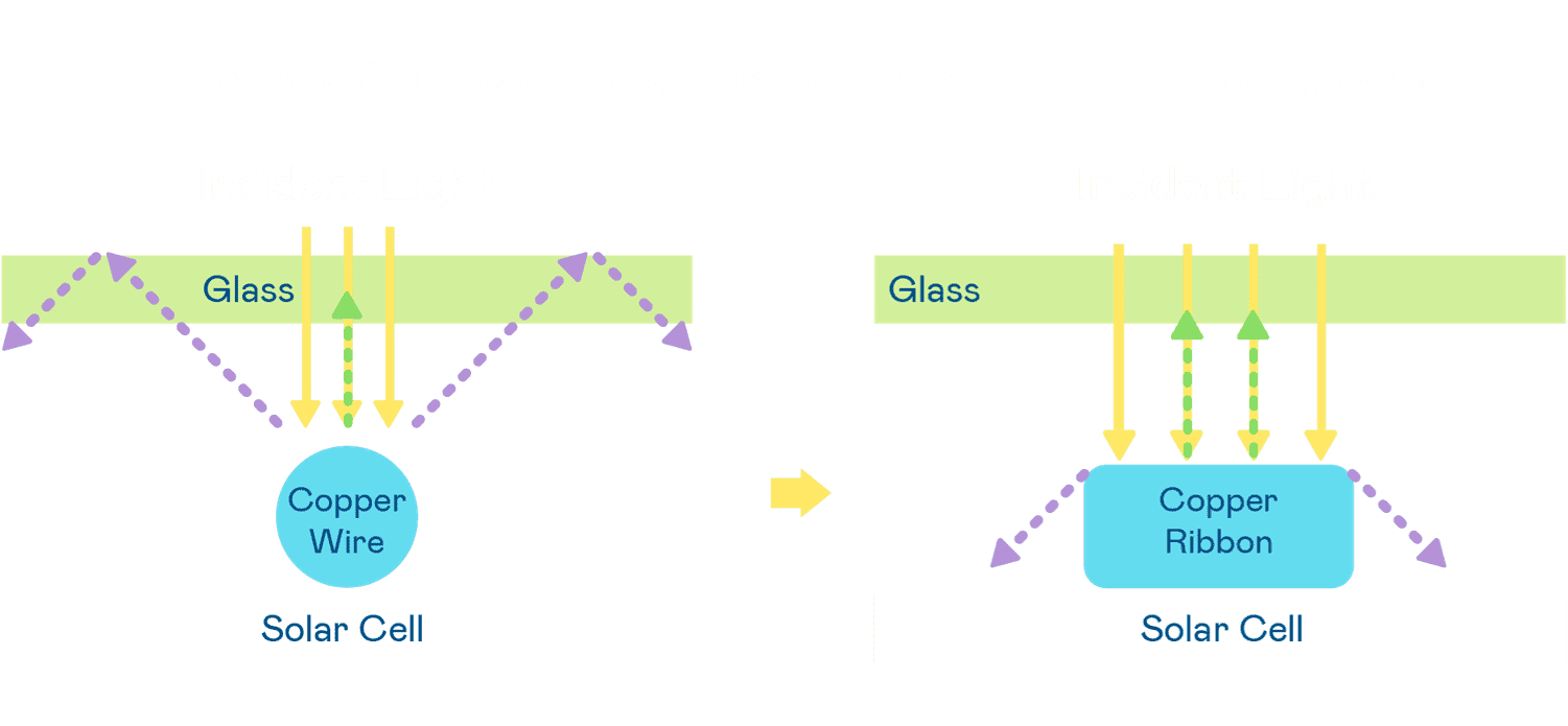 - 电池使用多条铜导线 (Copper wire) 于电池片上形成较短的电流路径,,,提高电流收集效率,,,,采用圆形设计的铜导线较传统扁平式的铜焊带 (Ribbon),,可增加入射至电池的光线量。。。。