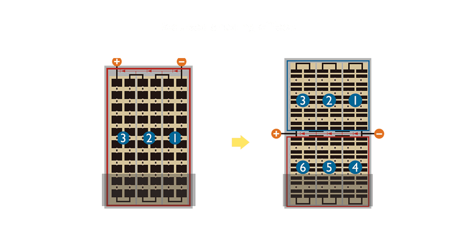- 结合半切电池,,,降低遮阴影响、、、提升模组抗隐裂能力、、、并减少电阻损耗,,,进一步提升模组发电效能。。