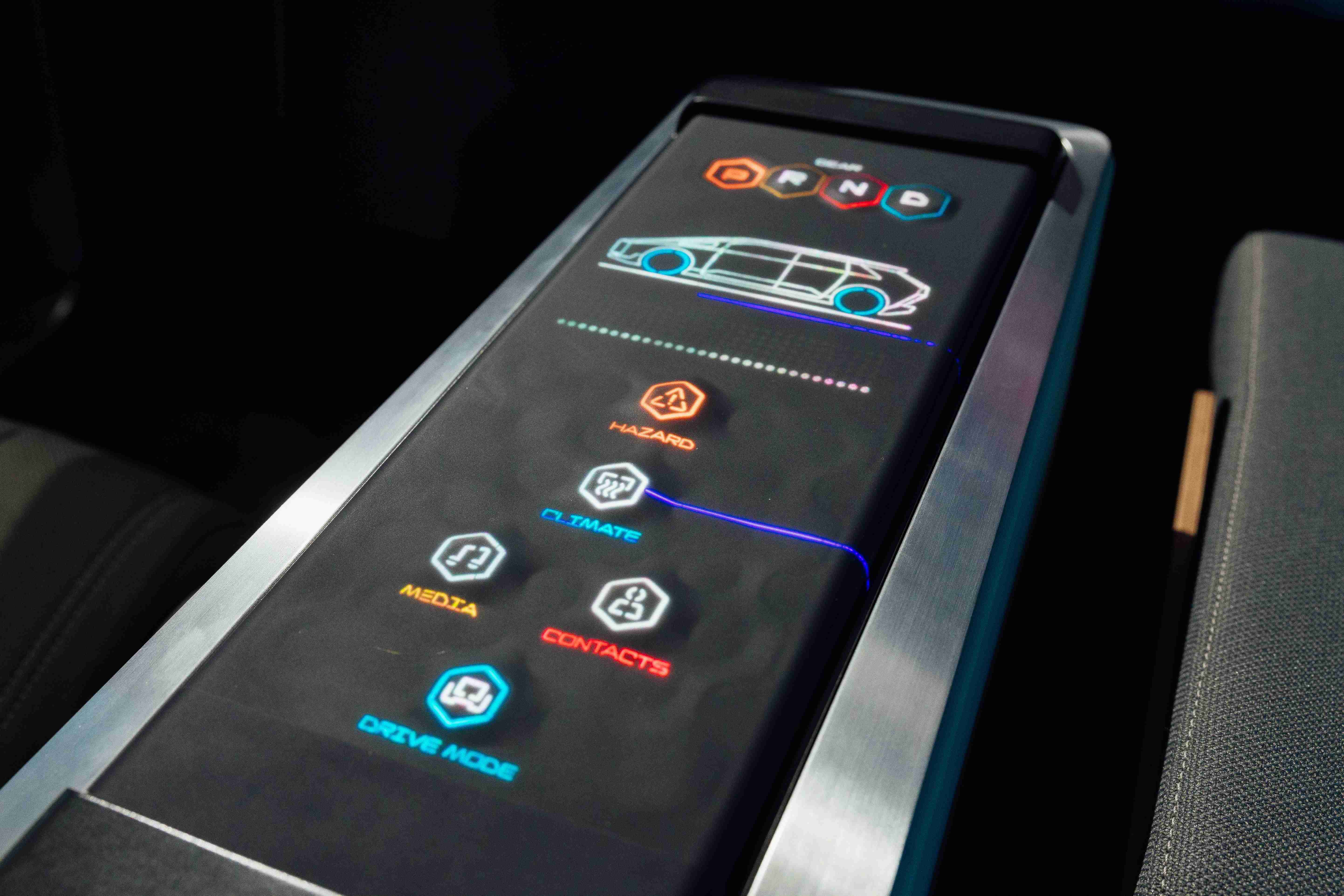 隐藏式智驾介面(Foldable Cruise Pilot)在不同模式下可以切换显示方式,,,在手动驾驶模式时,,,,显示器可以在半收合状态下,,仍呈现所需资讯;自驾模式时,,,显示器可以完全展开,,,满足不同的多媒体娱乐需求。。。 2121非凡Smart Cockpit 2025 在车头及车尾搭载合作伙伴Ennostar开发的互动式矩阵显示器(Interactive Matrix Display),,,,其突破传设计框架,,,利用优化的光源整合技术,,,提供更高亮度与对比度的显示效果,,营造驾车者个性化风格并传递讯息。。