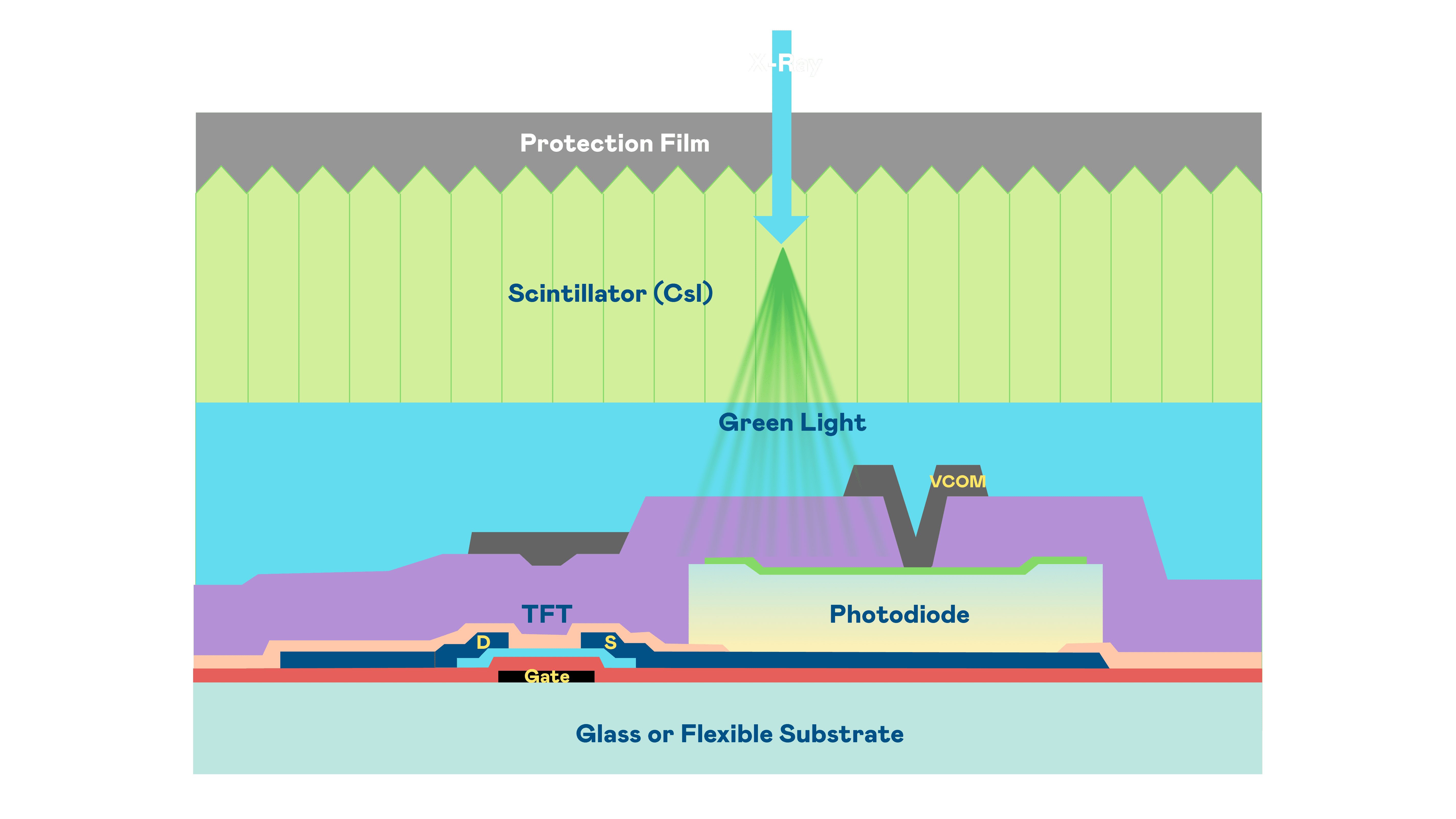 2121非凡的X光影像感测阵列使用薄膜电晶体 (TFT) 作为每个像素的读取开关,,,搭配光电二极体(Photodiode)的光电转换元件,,用以感测X光影像讯号。。。。